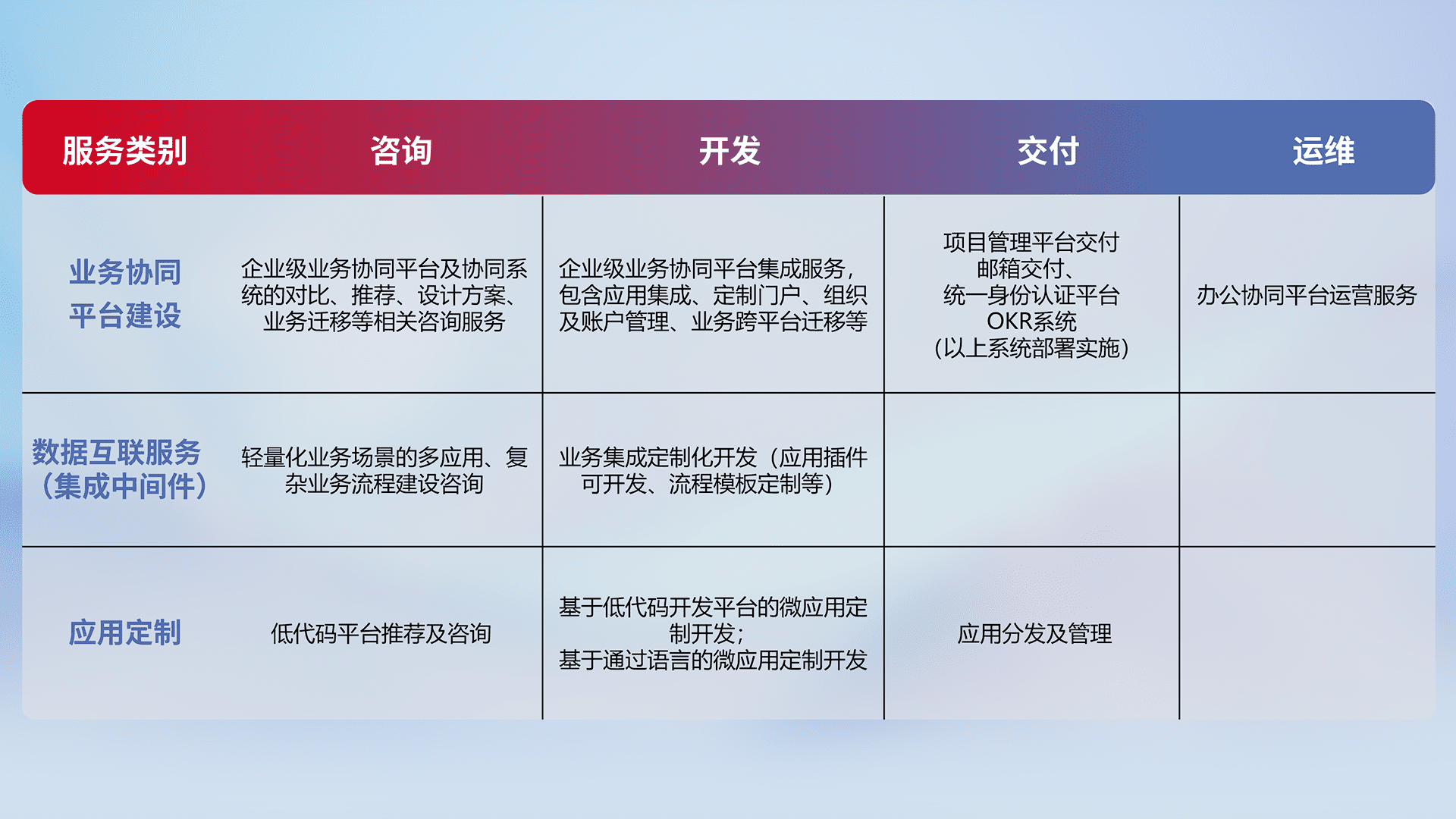 针对钉钉、、、企微、、IDaas等平台级产品提供产品的规划、、、方案、、交付、、、、定制化开发等服务,,,,实现如统一协同办公、、、智能客户服务、、混合会议管理、、智能数据查询、、等业务场景,,实现数字化转型。。。